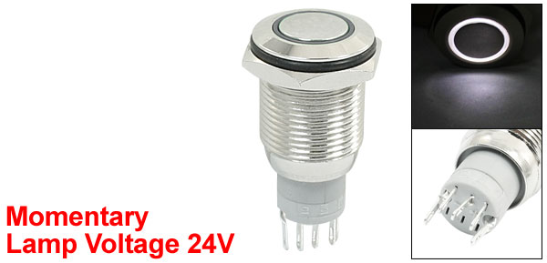 Product Name Push Button Switch Contact Type 1NO 1NC (SPDT) Action Momentary Working Current & Voltage 3A 250VAC Terminal Quantity 5 Light Color White Lamp Voltage 24V Mounting Thread Dia 16mm / 0.63" Total Size(Approx) 38 x 19mm/1.5" x 0.75"(L*Max.D) External Material Plastic, Metal Color Silver Tone Net Weight 15g Package Content 1 x Push Button Switch