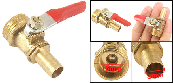 Product Name Ball Valve Thread Diameter 16mm/0.63'' Ball Hole Diameter 6mm/0.24'' Hose Tail OD 8mm/0.31'' Level Handle Size 45 x 11mm/1.77'' x 0.43'' (L*W) Overall Size 55 x 15 x 28mm/2.2'' x 0.6'' x 1.1'' (L*W*H) Color Gold Tone & Red Material Brass & Metal Weight 31g Package 1 x Ball Valve - Reviews