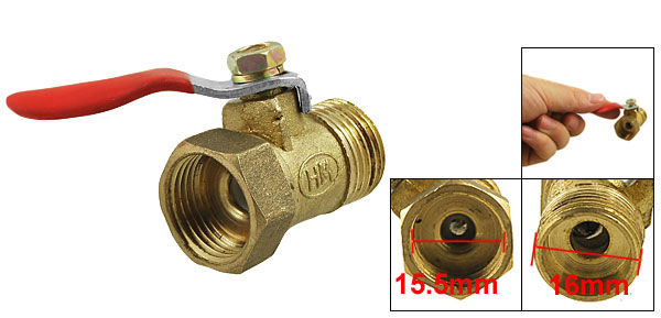 Product Name Ball Valve Female Thread Dia 15.5mm/ 0.61" Male Thread Dia 16mm/ 0.63" Thread Size 3/8"PT Level Handle Size 50 x 11mm/ 2" x 0.43" (L*W) Total Size(Excluded Handle) 32 x 19mm/ 1.3" x 0.75" (L*D) Color Brass Tone & Red Material Solid Brass Weight 38g Package 1 x Ball Valve - Reviews