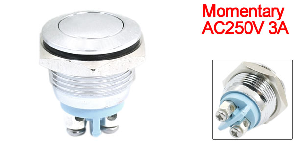 Item Name Push Button Switch Model MP16S/B10 Action Type Momentary Type Head Shape Ball Head Contact SPST(ON/OFF ) Switch Rating AC250V 3A Terminals Number 2 Panel Cutout Diameter 16mm/0.63" Total Size 23 x 19mm/0.91" x 0.75" (L*Max.W) Material Stainless Steel, Plastic, Electric Parts Housing Color Silver Tone Weight 16g Package Content 1 x Push Button Switch - Reviews