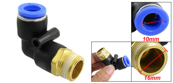Item Name Quick Fittings Overall Size 45 x 37 x 17mm/1.8" x 1.4" x 0.7"(L*W*T) Inner Diameter (Blue End) 10mm/0.393" Thread Diameter 16mm/0.63" Material Chrome-plated Brass & Plastic Color Black, Gold Tone, Blue Weight 26g Package Content 1 x Quick Fittings - Reviews