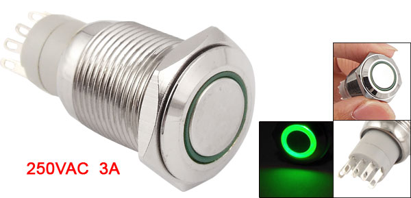 Item Name Stainless Push Button Switch Operation Type Self Locking Type LED Type Ring-illuminated LED Contact 1NO 1NC Head Design High Flat Switch Rating 250VAC, 3A Lamp Voltage 12V Operation Pressure 2.5-4N LED Color Green Pin Number 5 Thread Diameter 16mm/0.63'' Total Size 38 x 22mm/1.5'' x 0.9''(L*Max.W) Material Stainless , Electric Parts Housing Color Silver Tone Net Weight 15g Package Content 1 x Stainless Push Button Switch - Reviews