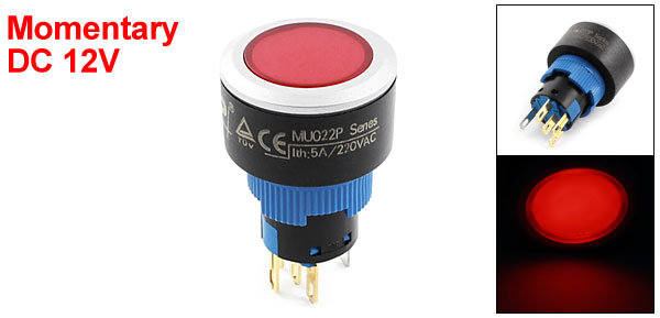 16mm Thread SPDT 1NO 1NC Momentary Red Pilot Lamp Push Button Switch DC 12V