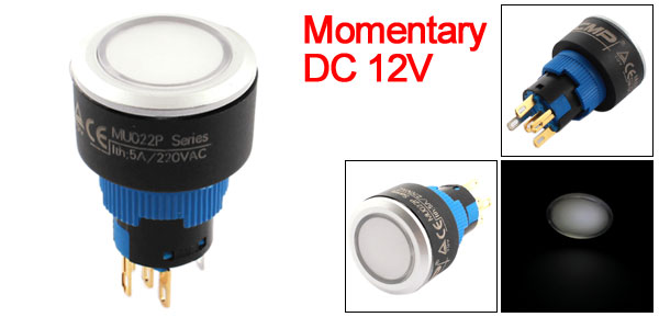Item Name Push Button Switch Model MU22P/F11 Contact Type SPDT(1NO 1NC) Action Type Momentary Type Rating AC 220V 5A Light Voltage DC 12V Light Color White Pin Number 5 Button Cap Dia 18mm/0.71" Mounting Thread Dia. 16mm/ 0.63" Total Size 25 x 33mm/1" x 1.3"(D*H) Material Plastic, Electronic Parts Color White, Black Weight 12g Package Content 1 x Push Button Switch - Reviews