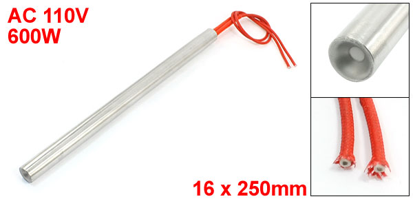 Product Name Cartridge Heater Material Stainless Steel, PVC, Nylon Rated Voltage AC 110V Power 600W Heater Size (Approx.) 16 x 250mm / 0.63" x 9.8" (D * L) Wire Length (Approx.) 26cm / 10.2" Color Red, Silver Tone