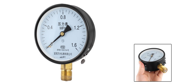 Product Name Pressure Gauge Pressure Intensity 0 ~ 1.6 Mpa Accuracy Class Class 1.6 Connector Type PT 1/2" Male Thread Case Size 9.9 x 3.8cm/ 3.9" x 1.5" (D*T) Color Black & White Material Metal, Plastic Net Weight 300g Package 1 x Water Pressure Gauge - Reviews