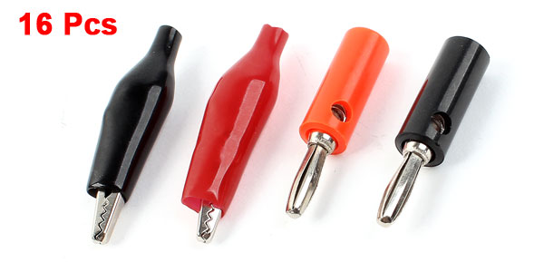 Details16pcs Multimeter Part Black Red Plastic Shell Alligator Clip + Banana Plug  Product Name Banana Plug + Alligator Clip Plug Type 4.0mm Clip Size 4.3 x 1.2 x 1cm/1.7" x 0.47" x 0.39"(L*W*T) Plug Size 4 x 0.85cm/1.6" x 0.335"(L*D) Material Metal, Plastic Color Red, Black Weight 40g Package Content 16 x Banana Plug + Alligator Clip