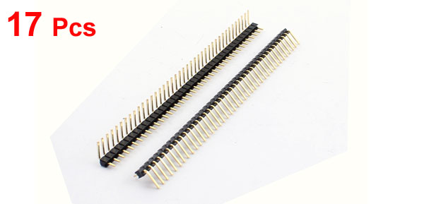 Product Name Header Connectors Pin Number 40 Row Single Mounting Angle Right Angle Pin Pitch 2.54mm/0.1" Total Size(Included Pin) 102 x 9 x 8mm/ 4.1" x 0.45" x 0.3" ( L*W*H) Material Plastic, Metal Color Black, Gold Tone Net Weight 41g Package Content 17 x Header Connectors - Reviews
