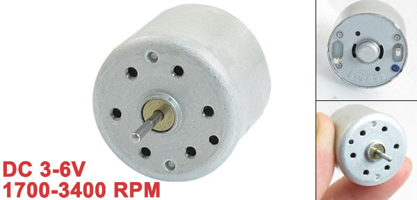 Product Name DC Motor Rated Voltage DC 3-6V Speed 1700-3400 RPM Mounting Screw Hole Diameter 1.6mm/0.06" Shaft Size 1.5 x 9mm/ 0.06" x 0.35"(D*L) Body Size 24 x 18mm/ 0.9" x 0.7" (D*H) Main Color Silver Tone Material Metal Net Weight 30g Package 1 x DC Motor - Reviews
