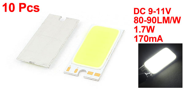 Product Name COB LED Lamp Beads Rated Voltage DC 9-11V Luminous Flux 80-90LM/W Color Temperature 6000-6500K Power 1.7W Current 170mA Light Color White Material Aluminum Color Silver Tone, Yellow Size 32 x 16mm/ 1.3" x 0.6" (L*W) Luminous Surface 26 x 14mm/ 1" x 0.55"(L*W) Weight 22g Package Content 10 x COB LED Lamp Beads - Reviews