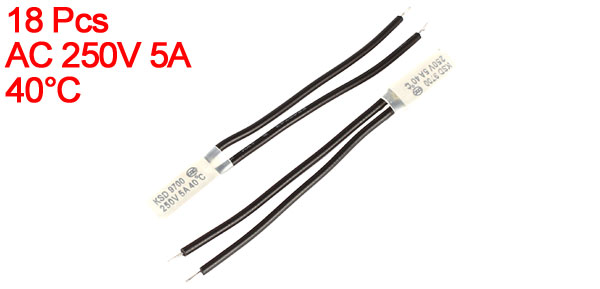 Product Name Temperature Control Switch Model.No KSD9700 Material Plastic, Bimetal Contact NC(Normal Close) Rated Voltage 250V Current 5A Max Rated Disconnection Temperature 40°C Color Black, White Cable Length 8cm/ 3.1" Head Dimension 20 x 8 x 3mm/0.78" x 0.31" x 0.12"(L*W*T) Net Weight 62g Package Content 18 x Temperature Control Switch - Reviews