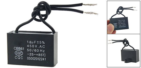 Product Name Motor Capacitor Housing Material Plastic Dielectric Material Metalized Polypropylene Model CBB61 Capacitance 1.8uF Tolerance 5% Rated Voltage 450VAC Frequency 50/60Hz Body Size 3.7 x 2.5 x 1.5cm / 1.45" x 1" x 0.6" (L * W * T) Wire Length(Approx.) 10cm / 3.9" Color As Picture Shown Weight 20g Package Content 1 x Motor Capacitor - Reviews
