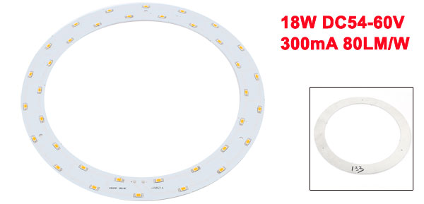 Product Name LED Aluminum Base Rated Voltage DC54-60V Luminous Flux 80LM/W Color Temperature 2800-3000K Power 18W Current 300mA Light Color Warm White Material Aluminum Color White, Orange Diameter 250mm/ 9.8" LED Type SMD 5630 LED Number 36 Weight 80g Package Content 1 x LED Aluminum Base - Reviews