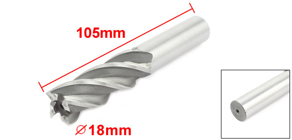 Product Name End Mill Cutter Material HSS Flute Number 4 Flutes Cutting Diameter 18mm/ 45/64" Shank Diameter 16mm/ 41/64"" Cutting Depth 50mm/ 2" Total Length 105mm/ 4.1" Mill Cutter Color Silver Tone, Gray Weight 154g Package Content 1 x Straight Shank End Mill Cutter