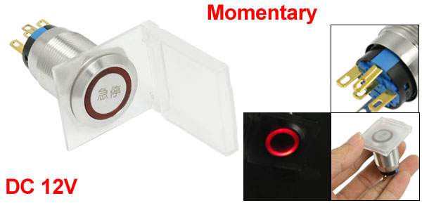 Item Name Push Button Switch Contact Type Momentary (1 NO 1 NC) Model MP019S/F Head Shape Flat Round Switch Rating AC250V, 5A Lamp Voltage DC 12V LED Color Red Pin Number 5 Mounting Thread Diameter 19mm / 0.75" Total Size (Approx.) 43 x 34mm / 1.7"x1.34" (L*W) Wateproof Cover Size (Approx.) 34 x 28mm / 1.34"x1.1" (L*W) Material Stainless, Electric Parts Housing Color As Picture Shown Net Weight 24g Package Content 1 x Push Button Switch - Reviews