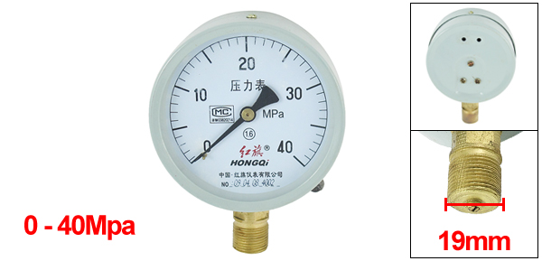 Product Name Pressure Gauge Pressure Intensity 0 -40Mpa Accuracy Class 1.6 (+/-1.6% fsd) Inlet Thread Diameter 4NPT/19mm Size 9.9 x 4.5cm/ 3.9" x 1.8" (D*T) Main Color White, Light Gray Exterior Material As Picture Show Net Weight 434g Package 1 x Pressure Gauge - Reviews