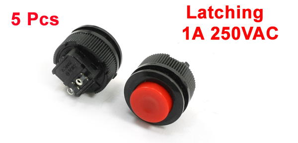 Product Name Push Button Switch Contact Type Latching (SPST) Working Current & Voltage 1A 250VAC Terminal Quantity 2 Mounting Dia 16mm/0.63" Total Size(Approx) 21 x 18mm/0.8" x 0.7"(L*D) External Material Metal, Plastic Color Red, Black Net Weight 11g Package Content 5 x Push Button Switch - Reviews