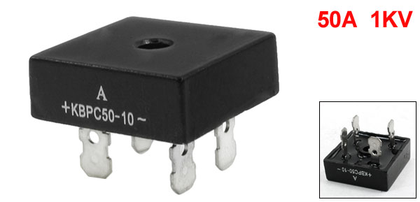 Product Name Bridge Rectifier Model KBPC50-10 Forward Current 50A Repetitive Reverse Voltage 1KV Body Size 31 x 31 x 10mm/ 1.2" x 1.2" x 0.39" (L*W*T) Mounted Hole Dia. 6mm/ 0.24" Material Resin, Metal Color Silver Tone, Black Net Weight 23g Package Content 1 x Single Phase Bridge Rectifier - Reviews