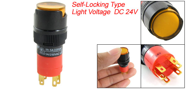 Product Name Push Button Switch w Lamp Model No. S1Y-11Z Button Color Orange Light Voltage DC 24V Action Type Self-Locking Contacts Number 1 NO, 1 NC Ith 5A Rated Voltage AC 220V (max. 250V) Rated Current 5A Button Diameter 16mm/ 5/8" Overall Size 18 x 47mm/ 0.7" x 1.9" (D*H) Color Orange, Red & Black Weight 8g Package 1 x Push Button Switch w Lamp - Reviews