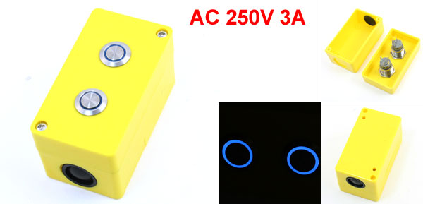 Product Name Push Button Station Action Type Latching Momentary Blue Round Flat Button Contact Type 1NO 1NC Working Voltage & Current 3A 250VAC Max. Withstand Current 16A Light Voltage 12V Light Color Blue Button Dia 1.8cm / 0.71" Overall Size 9 x 5 x 5cm / 3.5" x 2" x 2"(L*W*H) Wire Hole Dia 20mm/0.78" Mounting Hole Dia 4mm/0.16" Mount Hole Distance 60mm x 35mm / 2.4" x 1.4"(L*W) Material Plastic, Metal Color Yellow, Silver Tone, Blue Net Weight 82g