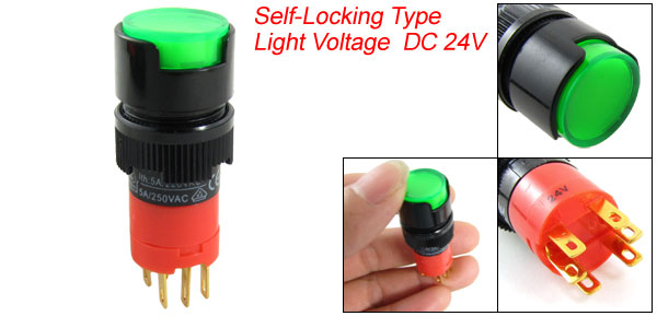Product Name Push Button Switch w Lamp Model No. S1Y-11Z Button Color Green Light Voltage DC 24V Action Type Self-Locking Contacts Number 1 NO, 1 NC Ith 5A Rated Voltage AC 220V (max. 250V) Rated Current 5A Button Diameter 16mm/ 5/8" Overall Size 18 x 47mm/ 0.7" x 1.9" (D*H) Color Green, Red & Black Weight 8g Package 1 x Push Button Switch w Lamp - Reviews