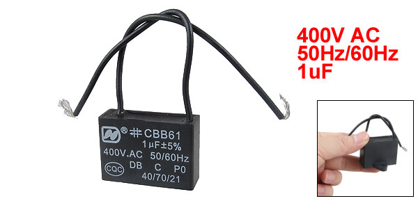 Details1uF 400VAC 50Hz/60Hz 2 Wire Electric Fan Capacitor CBB61  Product Name Fan Capacitor Model CBB61 Material(External) Plastic Rated Capacitance 1uF Tolerance ±5% Rated Frequency 50Hz/60Hz Rated Voltage 400V AC Body Size 3.2 x 2.2 x 2.1cm/1.3" x 0.89"x 0.81"(L*W*H) Screw Hole Diameter 4.5mm/ 0.18" Cable Length(Approx.) 9cm/ 3.5" Weight 13g Package Content 1 x Fan Capacitor