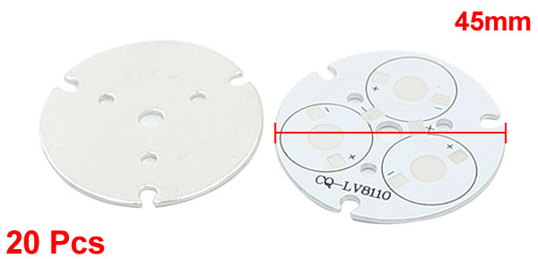Product Name Aluminum PCB Circuit Board Fit for 3pcs 1W/3W LED in Series Diameter 45mm/1.8" Thickness 1.4mm/0.05" Installation Hole Distance 19mm/0.75(Center to Center) Net Weight 107g Materials Aluminum Package Content 20 x Aluminum PCB Circuit Board - Reviews