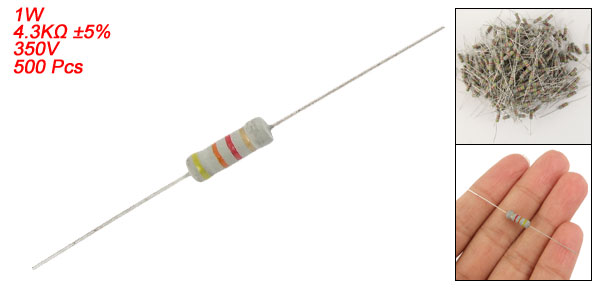 Product Name Carbon Film Resistor Material Type Carbon Film Rated Power 1W Resistance Value 4.3K Ohm Tolerance ±5% Withstand Voltage 350V Body Size 10.6 x 3.6mm / 0.417" x 0.142" (L * D) Lead Size (Each End) 23 x 0.4mm/0.9" x 0.016" (L*Dia.) Color As Picture Shown Weight 157g Package Content 500 Pcs(±2%) x Carbon Film Resistors - Reviews