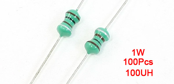 Product Name Color Ring Fixed Inductor Lead Type Axial Power Rating 1W Inductance Tolerance ± 10% Inductance 100 uH Total Size (Approx) 6.3 x 0.45cm / 2.5" x 0.18" (L*D) Material Coating Epoxy Resin Main Color Green, Silver Tone Weight 44g Package Content 100(+/-2%) Pcs x Color Ring Fixed Inductor  - Reviews