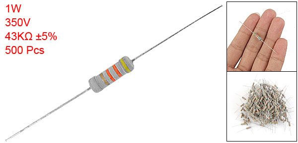 Product Name Carbon Film Resistors Material Type Carbon Film Rated Power 1W Resistance Value 43K ohm Tolerance ±5% Withstand Voltage 350V Total Size 57.1 x 3.6mm / 2.248" x 0.142" (L * D) Lead Diameter 0.4mm / 0.0157" Color As Picture Shown Weight 198g Package Content 500 Pcs (± 2%) x Carbon Film Resistors - Reviews