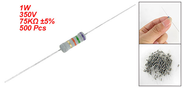 Product Name Carbon Film Resistors Rating Power 1W Resistance 75K Ohm Resistance Tolerance ± 5% Withstand Voltage 350V Size(Not Include Leads) 0.35 x 1.06cm / 0.138" x 0.417"(D*L) Leads Dia(Approx) 0.03cm / 0.012" Overall Length(Approx) 5.7cm / 2.2" Color As Picture Show Weight 172g Package Content 500(±2%) Pcs of Carbon Film Resistors - Reviews