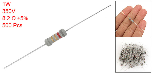Product Name Carbon Film Resistor Material Type Carbon Film Rated Power 1W Resistance Value 8.2 ohm Tolerance ±5% Withstand Voltage 350V Body Size (Approx.) 10.7 x 3.5mm /0.42" x 0.14" (L*Dia.) Lead Size (Each End) 23 x 0.4mm/0.9" x 0.016" (L*Dia.) Color As Picture Shown Weight 199g Package Content 500 Pcs(±2%) x Carbon Film Resistors - Reviews