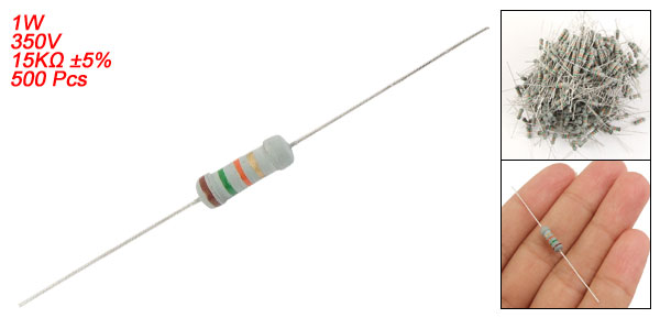 Product Name Carbon Film Resistor Material Type Carbon Film Rated Power 1 W Resistance Value 15K ohm Tolerance ±5% Withstand Voltage 350V Body Size (Approx.) 10.7 x 3.7mm /0.42" x 0.15" (L*Dia.) Lead Size (Each End) 23 x 0.4mm/0.9" x 0.016" (L*Dia.) Color As Picture Shown Weight 194g Package Content 500 Pcs(±2%) x Carbon Film Resistors - Reviews