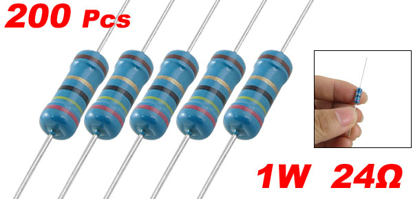 Product Name Metal Film Resistor Quantity 200±2% Pcs Rated Power 1W Tolerance ± 1% Resistance Value 24Ω T.C.R(Temperature Coefficient) ±50ppm/°C Body Size 4 x 11mm/ 0.16" x 0.43" (D*L) Leads Dia (Approx.) 0.5mm/ 0.02" Total Length (Approx.) 60mm/ 2.4" Color As Picture Shown Net Weight 109g Package Content 200 Pcs x Metal Film Resistors - Reviews