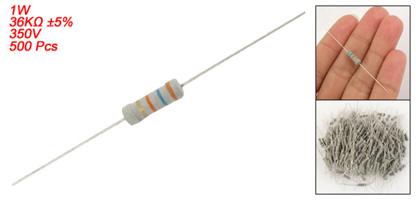 Product Name Carbon Film Resistors Material Type Carbon Film Rated Power 1W Resistance Value 36K ohm Tolerance ±5% Withstand Voltage 350V Total Size 57.1 x 3.6mm / 2.248" x 0.142" (L * D) Lead Diameter 0.4mm / 0.0157" Color As Picture Shown Weight 160g Package Content 500 Pcs (± 2%) x Carbon Film Resistors - Reviews