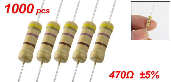 Product Name Carbon Film Resistor Material Type Carbon Film Rated Power 1W Resistance Value 470Ω Tolerance ±5% Body Size (Each One) 10.5 x 3.5mm / 0.41" x 0.138" (L*D) Lead Size (Each End) 24 x 0.3mm / 0.94" x 0.012" (L*D) Total Length (Approx.) 58mm / 2.28" Color As Picture Shown Net Weight 349g Package Content 1000 Pcs (± 2%) x Carbon Film Resistors - Reviews