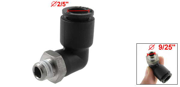 Product Name Pneumatic Quick Fitting Type Elbow Type One Touch Connector 10mm/ 2/5" Thread Connector 9mm/ 9/25" Material Plastic, Metal Size(Approx.) 3.3 x 3.3 x 1.7cm/ 1.3" x 1.3" x 0.7"(L*W*T) Main Color Black Weight 18g Package Content 1 x Pneumatic Quick Fitting - Reviews