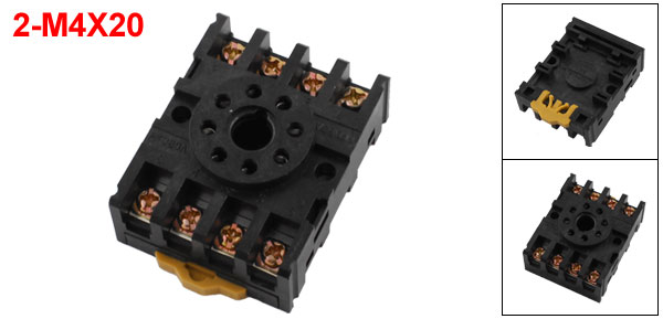 Product Name Relay Socket Base Model 2-M4X20 Pin Quantity 8 Total Size(Approx) 55 x 40 x 21mm / 2.2" x 1.6" x 0.8" (L*W*H) Installing Hole Diameter 4mm / 0.16" Mounting DIN Rail Width 35mm External Material Plastic Main Color Black Net Weight 34g Package Content 1 x Socket Base - Reviews