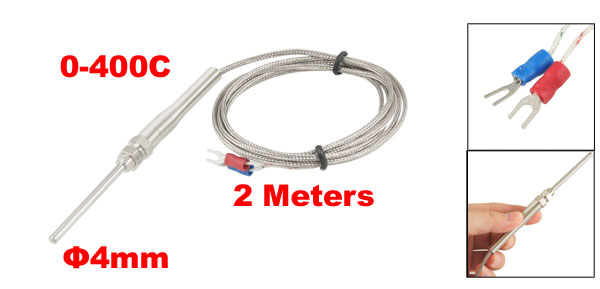 Product Name Thermocouple Transfer Type K Temperature Range 0-400C Thread Diameter 7.7mm / 0.3" Probe Length 50mm / 2" Probe Dia 4mm / 0.16" Fork Terminal Spacing 4mm / 0.16" Fork Terminal Size 9 x 5mm / 0.4" x 0.2"(L*W) External Shielding Metal Shield Total Length 2m/ 6.56ft Color Silver Tone Weight 43g Package Content 1 x Thermocouple - Reviews