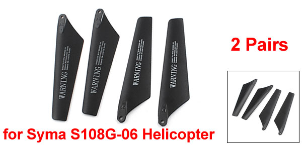 Details2 Pairs 90mm Dia Black RC Helicopter Main Blade 2A+2B for Syma S108G-06  Product Name Main Blade Fit for for Syma S108G-06 Helicopter Type 2A+2B Shaft Hole Dia 2.5mm / 0.1" Rotating Diameter 90mm /3.5" Width(Max.) 22mm/0.87" Max Thickness 1.5mm / 0.06" Material Plastic Color Black Net Weight 6g Package Content 2 Pairs x RC Helicopter Blade(Non-OEM)