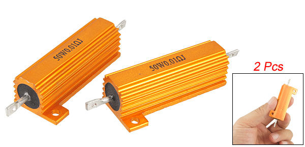 Product Name Aluminum Resistor Resistance Value 0.01 Ohm Power Rating 50W Resistance Tolerance ± 5% (J) Dimension 7.3 x 2.7 x 1.5cm/ 2.8" x 1" x 0.6" (D*W*H) Mount Size 4.2 x 2cm/ 1.6" x 0.8" (L*W) External Material Aluminum Color Gold Tone Net Weight 48g Package Content 2 x Aluminum Resistors - Reviews