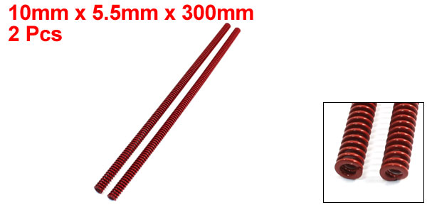Product Name Compression Spring Type US Standard Size 10 x 5.5 x 300mm/0.39" x 0.22" x 11.8"(OD* Inner Dia * L) Materials Chromium Alloy Color Red Net Weight 97g Package Content 2 x Compression Spring - Reviews