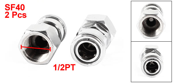 Product Name Air Quick Coupler Type SF40 End Inside Dia 13mm/ 0.51" Female Thread Dia. 18.6mm / 1/2PT Fluid Air Overall Size 45 x 24mm / 1.8" x 0.94" (L * Max.D) Color Silver Tone Material Metal Weight 170g Package 2 x Air Quick Coupler - Reviews