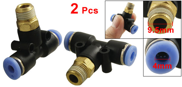 Product Name Pneumatic Quick Fittings Type T Connector One Touch Connector 4mm/ 0.157" Male Thread OD 9.5mm/ 0.374" Thread Size 1/8" Material Plastic, Metal Dimension (Approx) 3.7 x 3 x 1.1cm/ 1.45" x 1.18" x 0.43" (L*W*T) Color Black, Blue Weight 23g Package Content 2 x Pneumatic Quick Fittings - Reviews