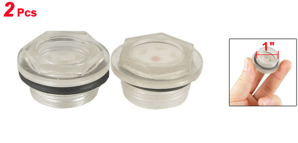 Details2 Pcs 1" Male Threaded Plastic Oil Leveler Sight Glass for Air Compressor  Product Name Oil Level Sight Glass Fit for Air Compressor Material Plastic Color Clear, Black, Red Thread Diameter 1" Total Size 57 x 23mm / 2.2" x 0.9" (Max. D * H) Weight 17g Package Content 2 x Oil Level Sight Glass