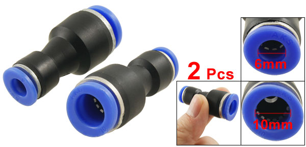 Product Name Pneumatic Quick Fitting Connector Type 10mm to 6mm Material Plastic Size (Approx) 4 x 1.8cm / 1.6" x 0.7" (L*Max.D) Color Black, Blue Weight 18g Package Content 2 x Pneumatic Quick Fitting - Reviews