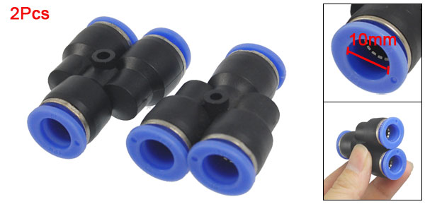 Details2 Pcs 10mm Y Union Instant Connector One Touch Fittings  Product Name One Touch Fitting Inner Diameter (Blue End) 10mm / 0.394" Overall Size(Approx) 37 x 18 x 49mm / 1.5" x 0.7" x 1.9" (L*W*H) Material Plastic Color Blue & Black Weight 44g Package Content 2 x One Touch Fittings