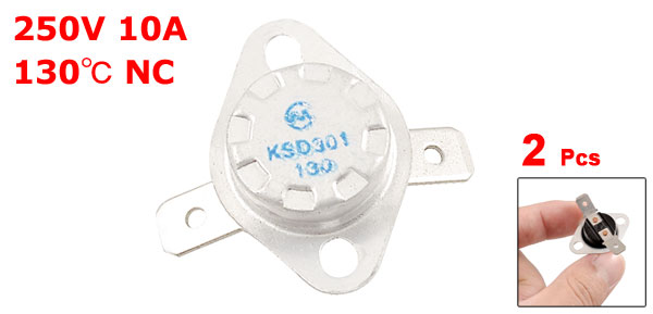Product Name Temperature Switch Thermostat Model No. KSD301 Action Type Normal Close (N.C.) Action Temperature 130C / 266F Voltage 250V 10A Circuit Resistance 50 Mohm Insulation resistance 100 Mohm Size (Each) 3.4 x 1.2cm / 1.3" x 0.47" (L*H) Mounting Hole Spacing 2.4cm / 0.94" Material Metal, Plastic Color Black, Silver Tone Net Weight 12 g Package Content 2 x Temperature Switch Thermostat - Reviews
