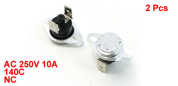 Details2 Pcs 140C Celsius NC. 2 Pin Bent Foot Design Manual Reset Thermostat 10A AC250V  Product Name Plastic Thermostat Model.No KSD301 Action Type NC Action Temperature 140C Voltage 10A AC 250V Size(Each) 3.3 x 1.9 x 2cm/1.3" x 0.75" x 0.78"(L*T) Material Metal, Plastic Color Black, Silver Tone Net Weight 15g Package Content 2 x Plasitc Thermostat