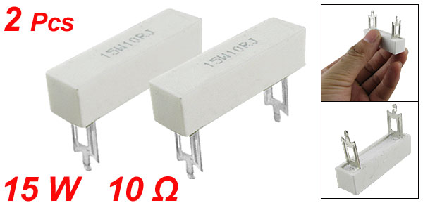 Product Name Cement Resistor Body Material Cement Power 15W Resistance 10Ω Tolerance ±5% Body Size (Approx.) 48 x 12 x 12mm / 1.9" x 0.47" x 0.47" (L*W*H) Pin Size (Approx.) 20 x 10mm / 0.78" x 0.4"(L*W) Pitch Distance 34mm/ 1.3" Color White Weight 39g Package Content 2 x Cement Resistor - Reviews